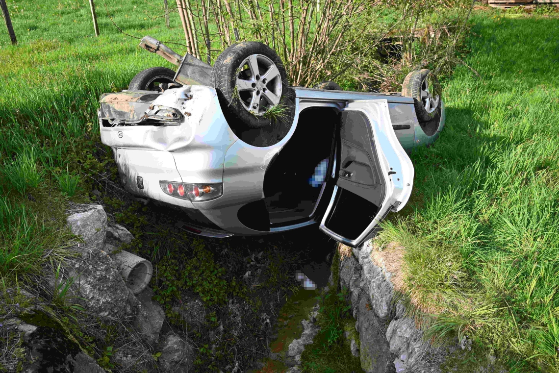 Ein 18-Jähriger fuhr mit seinem Auto auf der Umfahrungsstrasse Ebnat-Kappel, von Nesslau herkommend in Richtung Wattwil. In einer Kurve auf Höhe der Liegenschaft Lüpfertwil 2284 brach das Fahrzeugheck linksseitig aus. Folglich rutschte das Auto quer zur Fahrbahn über das Trottoir und den Vorplatz. Am Ende des Vorplatzes hob das Auto aufgrund einer Mauer ab und kam im Bachbett, auf dem Dach liegend, zum Stillstand. Der 18-jährige Autofahrer und die 13-jährige Beifahrerin wurden bei dem Unfall nicht verletzt. Es entstand Sachschaden in der Höhe von rund 5’500 Franken.