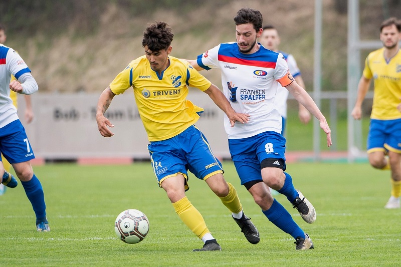 Bild: Szene vom Derby Schaan-Triesenberg am 23.April 2022. Pascal Koller (FC.T.berg, r.) gegen Fabian Quaderer (Schaan). Heute haben beide Teams Heimspiele: Schaan gegen Rüthi und Triesenberg gegen Rebstein.