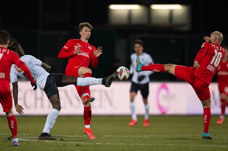 28.2.2022, Rheinparkstadion, Vaduz. Im Bild Cicek (rechts) und Fehr, der von GC definitiv übrnommen wird.Foto: Jürgen Posch