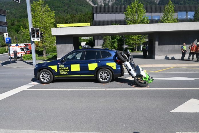 Ein Mann fuhr gegen 16:30 Uhr mit seinem Motorrad auf der Feldkircher Strasse in nördliche Richtung. Als ein Dienstfahrzeug des Bundesamtes für Zoll und Grenzsicherheit vor ihm verkehrsbedingt bis zum Stillstand anhalten musste, kollidierte er mit diesem. Dabei kam der Mann zu Sturz und erlitt Verletzungen. Er wurde mit dem Rettungsdienst des Roten Kreuzes ins Spital gebracht. An beiden Fahrzeugen entstand Sachschaden.