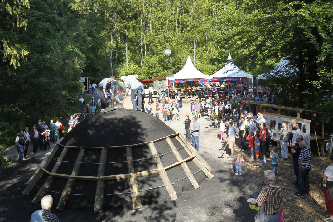 Nach fünf Tagen Aufbauarbeit (16. – 20. Mai) wird Freitagabend, 20. Mai, der Holzkohlemeiler auf dem Wisseler-Platz im Duxwald angezündet – ein feierlicher Moment, der den Auftakt des zweiten Schaaner Köhlerfests bildet.