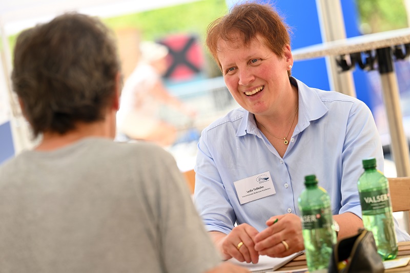 Im Anschluss daran fand die Sprechstunde zum IBK-Kleinprojektefonds statt. Ein Angebot für Interessierte, die sich über Fördermöglichkeiten für grenzüberschreitende Projekte informieren wollten. „Das Ziel des IBK-Kleinprojektefonds ist, die vertrauensvollen grenzüberschreitenden Beziehungen auf lokaler und regionaler Ebene zu stärken und die grenzüberschreitende institutionelle Zusammenarbeit in der Bodenseeregion zu verbessern“, so die Koordinatorin des IBK-Kleinprojektefonds Lydia Tollkühn, die vor Ort Rede und Antwort stand. Das grenzüberschreitende Förderprogramm des IBK-Kleinprojektefonds bietet sich an für Vereine, Privatpersonen, Institutionen, Kommunen oder NGOs. Wichtigste Fördervoraussetzung ist, dass die geplanten Projekte von mindestens zwei Partnern aus unterschiedlichen Staaten der IBK- beziehungsweise Interreg-Gebietskulisse geplant und umgesetzt werden.