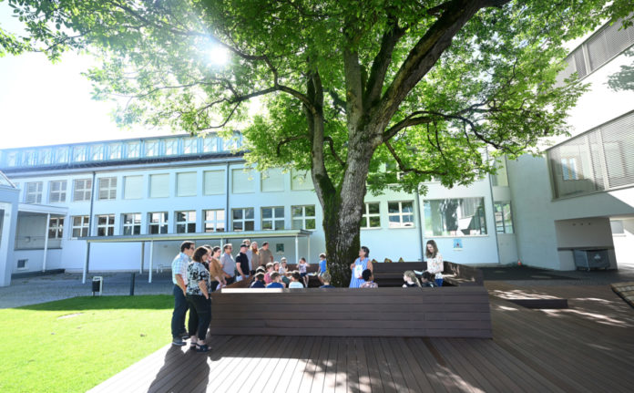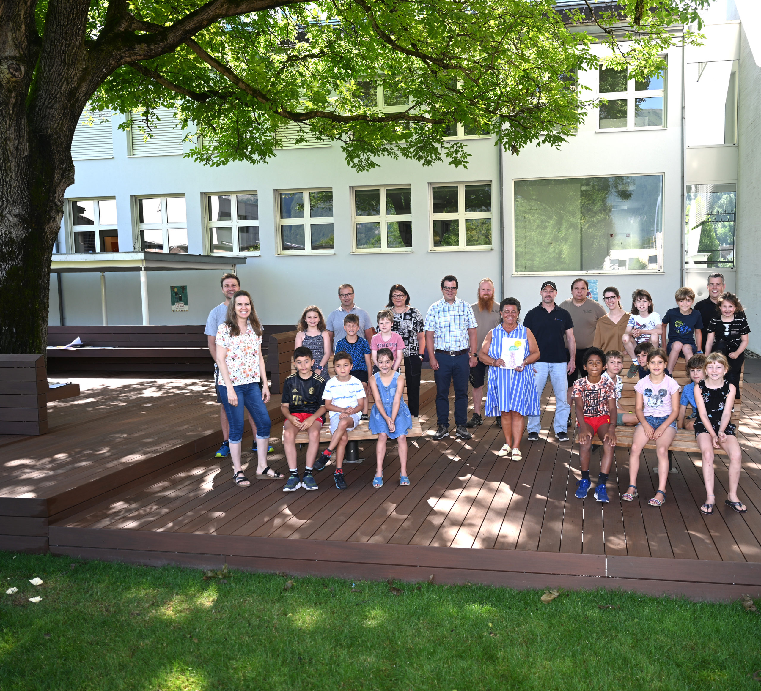 Am Donnerstag, 23. Juni hat Vorsteherin Maria Kaiser-Eberle gemeinsam mit der Schulklasse 2a die neue Sitzplattform unter dem Nussbaum im Schulinnenhof eröffnet. Dies war auch der Wunsch vieler Kinder, welche sich aktiv an diesem Projekt beteiligten. Die Sitzplattform dient ab sofort als Leseecke, Unterrichtsraum im Freien und als Entspannungsort im Schatten während heisser Sommertage.