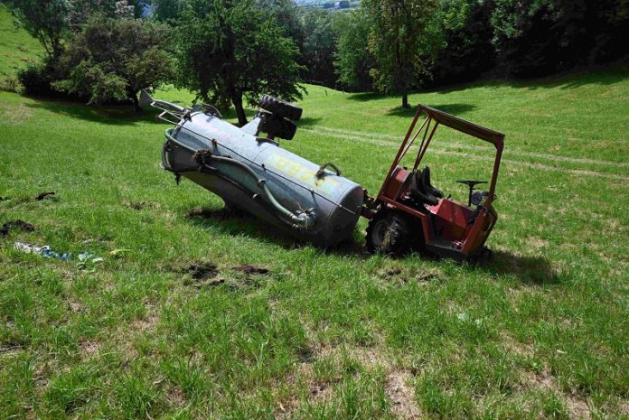 Der 28-Jährige fuhr mit seinem landwirtschaftlichen Fahrzeug ins geneigte Gelände. Da das beladene Druckfass voll war und er zu weit in den Steilhang hinauffuhr, verlagerte sich der Schwerpunkt des Fahrzeuges. Dabei kippte es zur Seite und überschlug sich einmal.