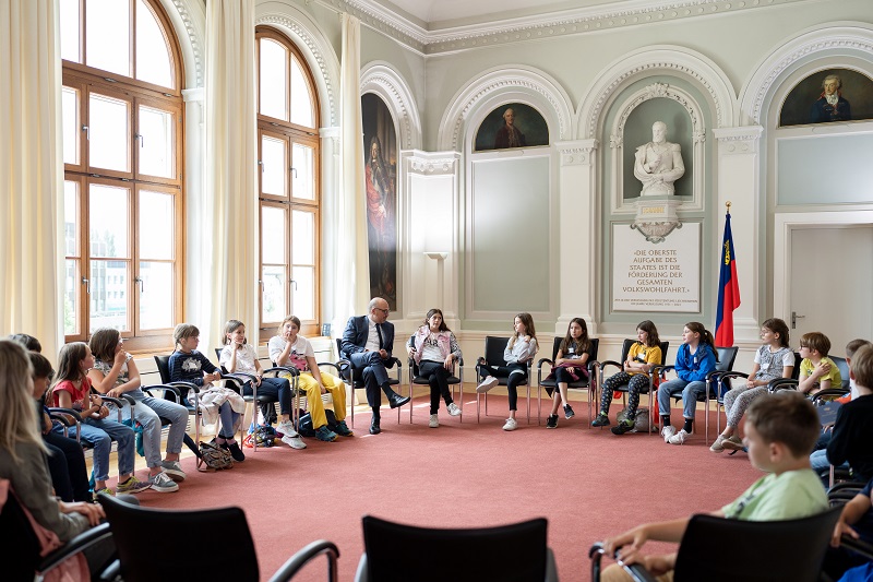 Beim Gegenbesuch in Vaduz, der nun im Gegensatz zum Termin im November ohne Corona-Einschränkungen stattfinden konnte, führte der Regierungschef die Schülerinnen und Schüler durch das Regierungsgebäude und gab ihnen einen Einblick in die Regierungstätigkeit. „Es ist mir ein persönliches Anliegen, dass das Interesse von Kindern und Jugendlichen für unseren Staat und die Politik schon früh geweckt wird“, sagte Daniel Risch. „Der direkte Austausch mit den Kindern ist inspirierend und zeigt, wie wichtig es ist, dass wir den Jüngsten zuhören und sie einbinden. Schliesslich sind sie die Zukunft unseres Landes.“