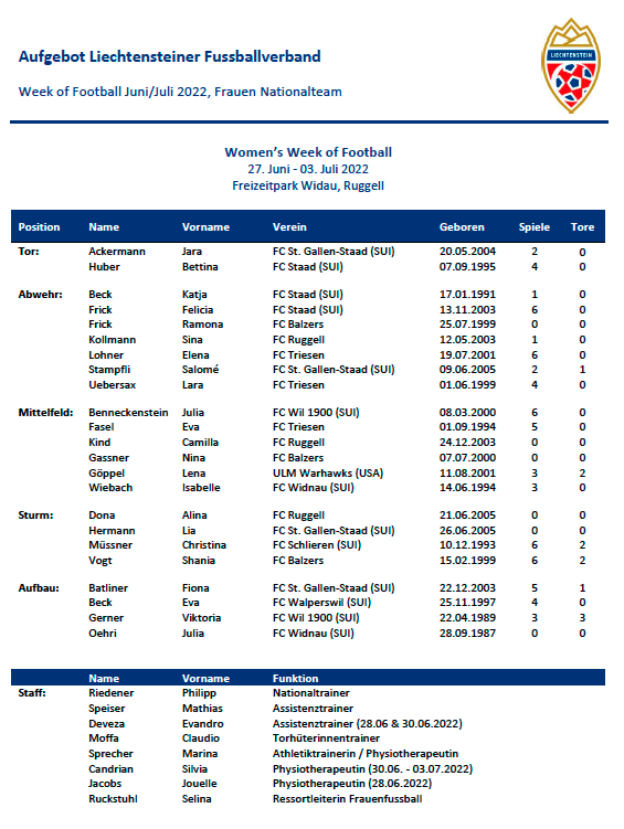 Das Liechtensteiner Frauen Nationalteam trifft sich vom 27. Juni bis 3. Juli für eine Trainingswoche mit einem Testspiel gegen ein ukrainisches Team.