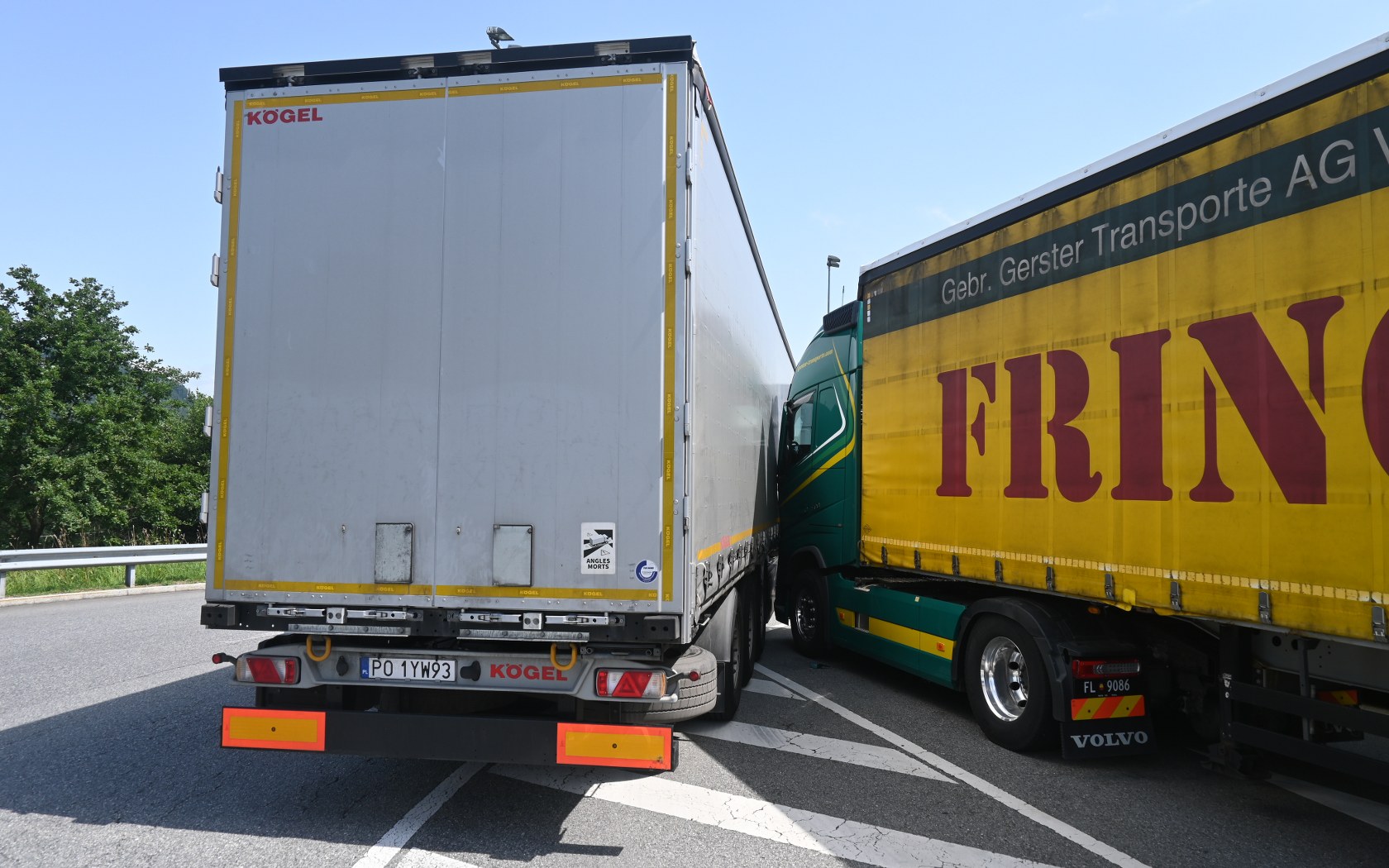 In Schaanwald kam es gegen 10.50 Uhr zu einer Kollision auf dem Amtsplatz beim Zollamt. Ein Lastwagenlenker kollidierte dabei mit seiner Fahrzeugkombination gegen einen geparkten Sattelschlepper, da dieser zu wenig ausholte.