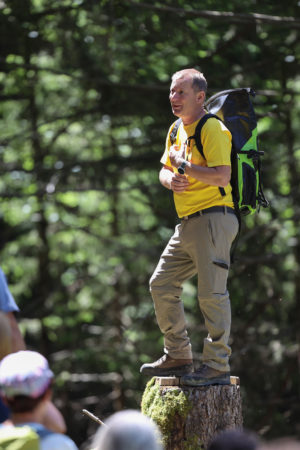 Anschliessend begrüsste Gemeindevorsteher Freddy Kaiser die zahlreichen Gäste, die daraufhin Gemeindeförster Peter Jäger in die steilen Hänge des Maurer Bergs Richtung Kracha-Rüfe. Anhand von Hinweistafeln erläuterte er die unterschiedlichsten und stetig wachsenden Anforderungen unserer Gesellschaft an das Ökosystem Wald. Ebenso zeigte er die Auswirkungen Folgen des Klimawandels: So sind heute Pflanzen auf 1000 m Meereshöhe heimisch, die es vor 20 Jahren noch nicht gab.