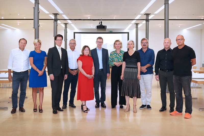 Bild: Jury: Helmut Dietrich, Architekt, Bregenz, Tina Hilti Präsidentin Stiftungsrat Landesbibliothek, Regierungsrat Manuel Frick, Ralph Beck, Architekt, Triesen, Antje Moser, Wilfried Oehry, Leiter Landesbibliothek, Regierungsrätin Graziella Marok-Wachter, Heidi Stoffel, Architektin, Weinfelden, Werner Binotto, Architekt, Altstätten, Hanspeter Schreiber, Architekt, Vaduz, Thomas Keller, Architekt, Schaan. Quelle: IKR