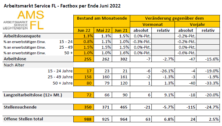 Beim Arbeitsmarkt Service Liechtenstein (AMS FL) waren Ende Juni 255 Arbeitslose gemeldet, 7 Personen weniger als im Vormonat.