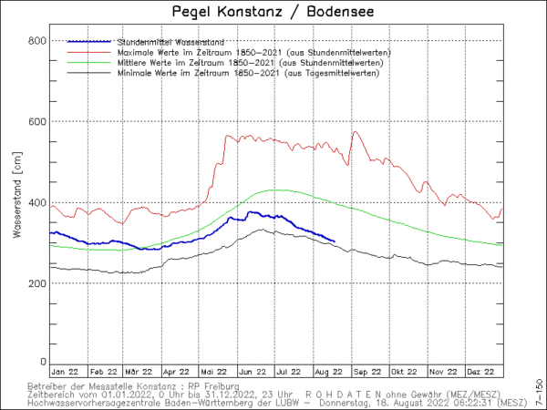 Der Klimawandel lässt aber nicht nur die Wassertemperaturen steigen, er verändert offensichtlich auch die Pegelstände am Bodensee. Im Vergleich zu früher werden deutlich niedrigere Seespiegel, so wie jetzt im Sommer 2022, zunehmend die Regel. Ein noch niedrigerer Wasserstand im Juli und August wurde zuletzt im Jahr 2006 gemessen. Normalerweise hat der Bodensee im Sommer maximale Pegelstände, während sie im Winter – und hier zumeist im Februar – am niedrigsten sind. Im Mittel der Jahre 1981 bis 2021 betrug dieser jahreszeitliche Unterschied etwa 1,3 Meter. Der Grund liegt im überwiegend alpinen Einzugsgebiet des Sees: Im Winter fallen dort die Niederschläge als Schnee. Diese fehlen dem See zunächst, dafür lässt dann die Schneeschmelze im späten Frühjahr und Sommer die Pegelstände steigen. „Die Messreihen am Pegel Konstanz, die mehr als hundert Jahre zurückreichen, zeigen, dass der Wasserstand des Sees im Winter zunimmt und im Sommer geringer wird“, erläutert Grambow.