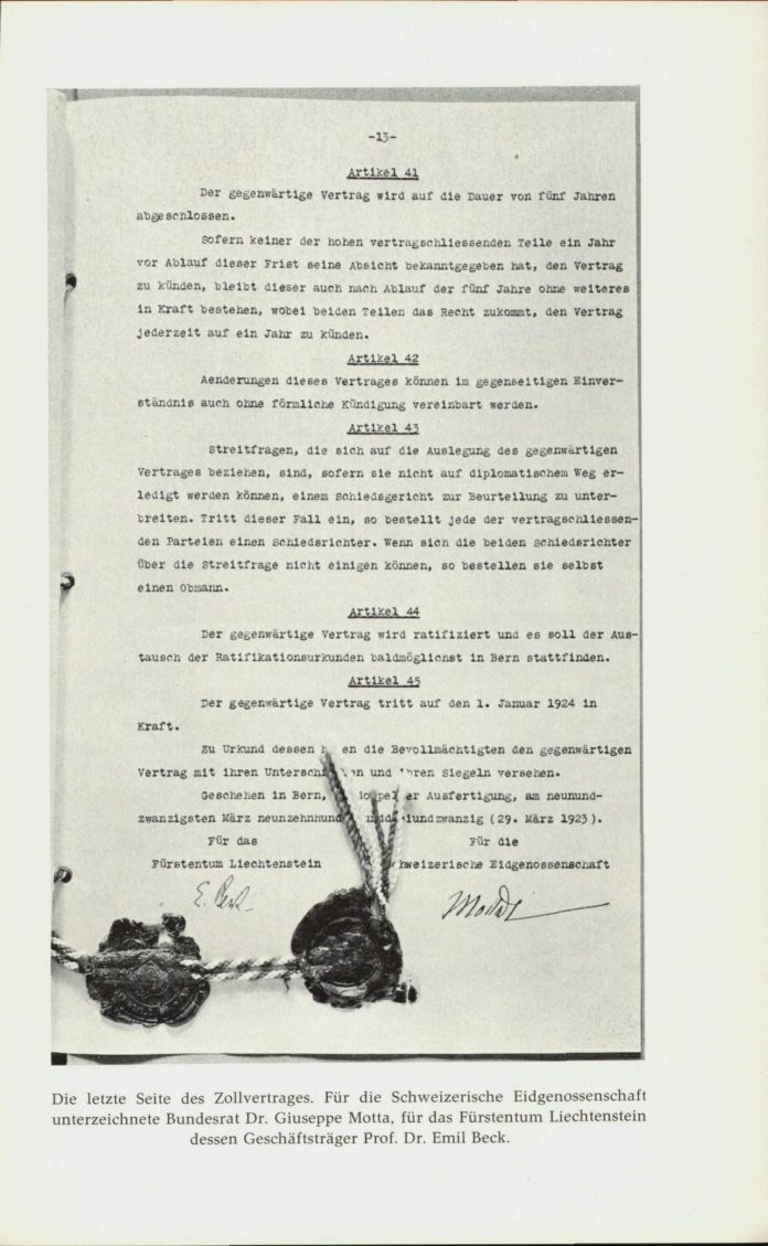 Zollvertrag (letzte Seite)zwischen der Eidgenossenschaft und dem Fürstentum Liechtenstein, abgeschlossen am 29. März 1923.