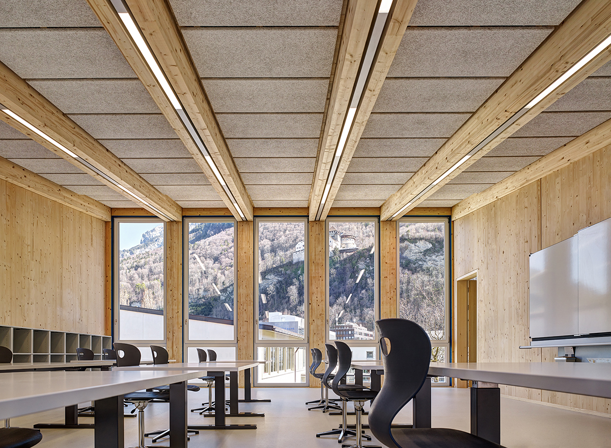 Mit einer Anerkennung hat es dieses Mal ein Liechtensteiner Projekt in die Auszeichnungen und damit in den engsten Kreis der vorbildlichen Bauten im Alpenbogen geschafft. Das Schulraumprovisorium Matador der Berufsmittelschule auf dem Giessen Schulareal von Studio SAAL aus Vaduz unter der Leitung von Architekt Lukas Pankraz wurde in der Laudatio von der Jury insbesondere für die konsequente Zerlegbarkeit gewürdigt: «Lichtdurchflutet und mit grosszügigen Raumhöhen blickt man direkt hoch zum Schloss des Fürsten von Liechtenstein. Der Bau aus Massivholz mit Holzfenstern und Holzfaserplatten, sowie Böden aus Linoleum schaffen eine angenehme Atmosphäre. … Das Amt für Bau und Infrastruktur hat als Bauherrschaft gezeigt, dass es sich lohnt, auch bei Provisorien die NutzerInnen nicht ausser Acht zu lassen und hat mit den geringen Mehrkosten gegenüber der Containerlösung sehr viel bewirkt. Vorbildlich, nicht nur für temporäre Bauten, sondern für unsere gesamte Bauwirtschaft, ist der konsequent umgesetzte Ansatz der Komplexitätsreduktion und Zerlegbarkeit, der uns in eine Kreislaufwirtschaft aus nachwachsenden Baustoffen führen soll.» (Laudatio Robert Mair 16.9.2022, Preisverleihung im alpinen Museum, Bern)