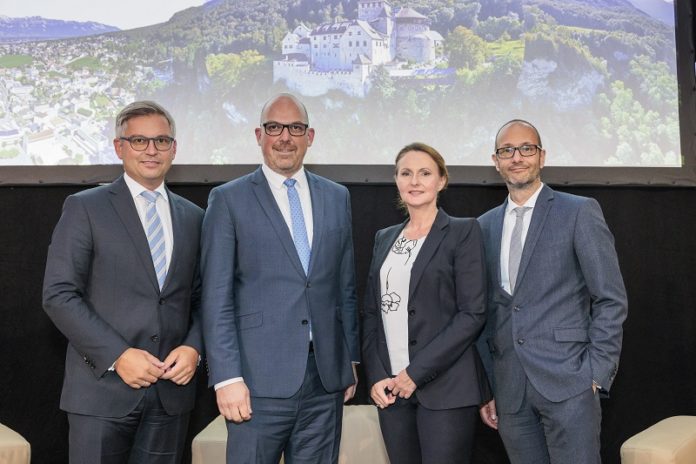 Bild (v.l.) Dr. Magnus Brunner (Bundesminister für Finanzen der Republik Österreich), Dr. Daniel Risch (Regierungschef), Eva Komarek (Moderatorin, DIE PRESSE), Simon Tribelhorn (Präsident Liechtenstein Finance)