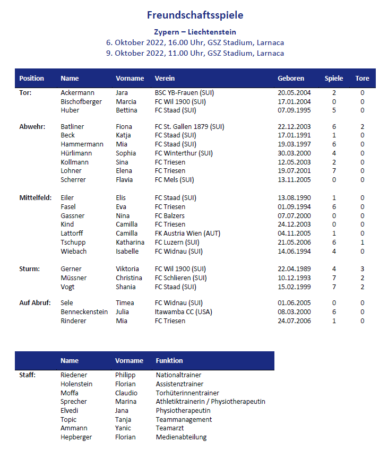 Für diese zwei Spiele bereitet sich das Frauen Nationalteam ab Montag vor, am Mittwoch in der Früh fliegt die Delegation nach Zypern, bevor am Donnerstagnachmittag (15 Uhr MESZ) der erste Anstoss erfolgen wird. Das zweite Spiel steigt dann am Sonntagvormittag (10 Uhr MESZ) ehe das Team am Abend die Heimreise antreten wird.
