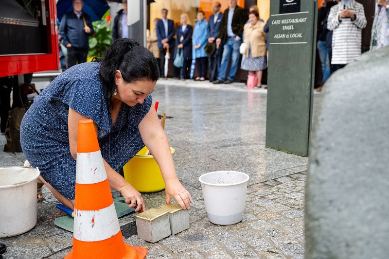 Bildlegende: Katja Demnig von der Stiftung „Spuren – Gunter Demnig“ verlegt die zwei Stolpersteine. (Bild Gemeinde Vaduz/Julian Konrad)