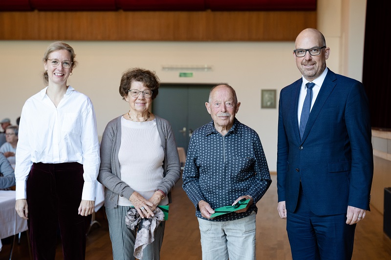 Regierungschef-Stellvertreterin Sabine Monauni, die älteste Teilnehmerin Trudy Bricci, der älteste Teilnehmer Othmar Eberle und Regierungschef Daniel Risch bei der Ehrung. Quelle: IKR