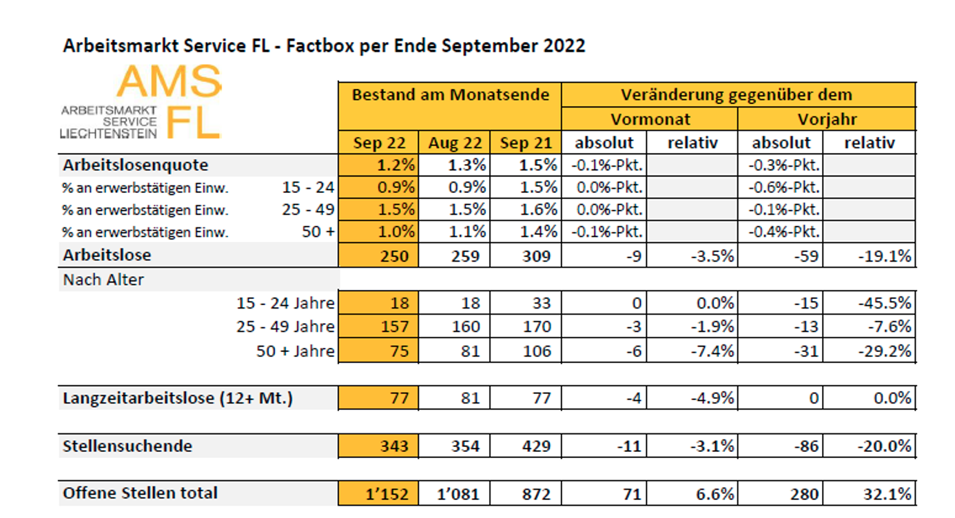 Beim Arbeitsmarkt Service Liechtenstein (AMS FL) waren Ende September 250 Arbeitslose gemeldet, 9 Personen weniger als im Vormonat. Die Arbeitslosenquote verringert sich damit von 1,3 Prozent im August 2022 auf 1,2 Prozent im Berichtsmonat. Gegenüber dem Vorjahresmonat verringerte sich die Arbeitslosigkeit um 59 Personen (-19,1 %). Die Arbeitslosenquote sank gegenüber dem Vorjahresmonat um 0,3 Prozentpunkte.