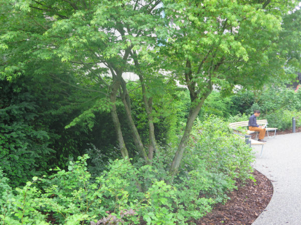 Im Prüfbericht wird unter anderem das begrünte Parkhaus mit seinen bis zu 8 Metern hohen Kletterpflanzen, die den Bau umschliessen, als beispielhaft erwähnt. Die naturnahen Waldflächen mit überwiegend Lärchen und Föhren werden für «die einem Gebirgswald ähnliche Anordnung» ebenso gelobt wie die Parkanlagen an den neuen Gebäuden für die vielfältigen Nutzungsmöglichkeiten.