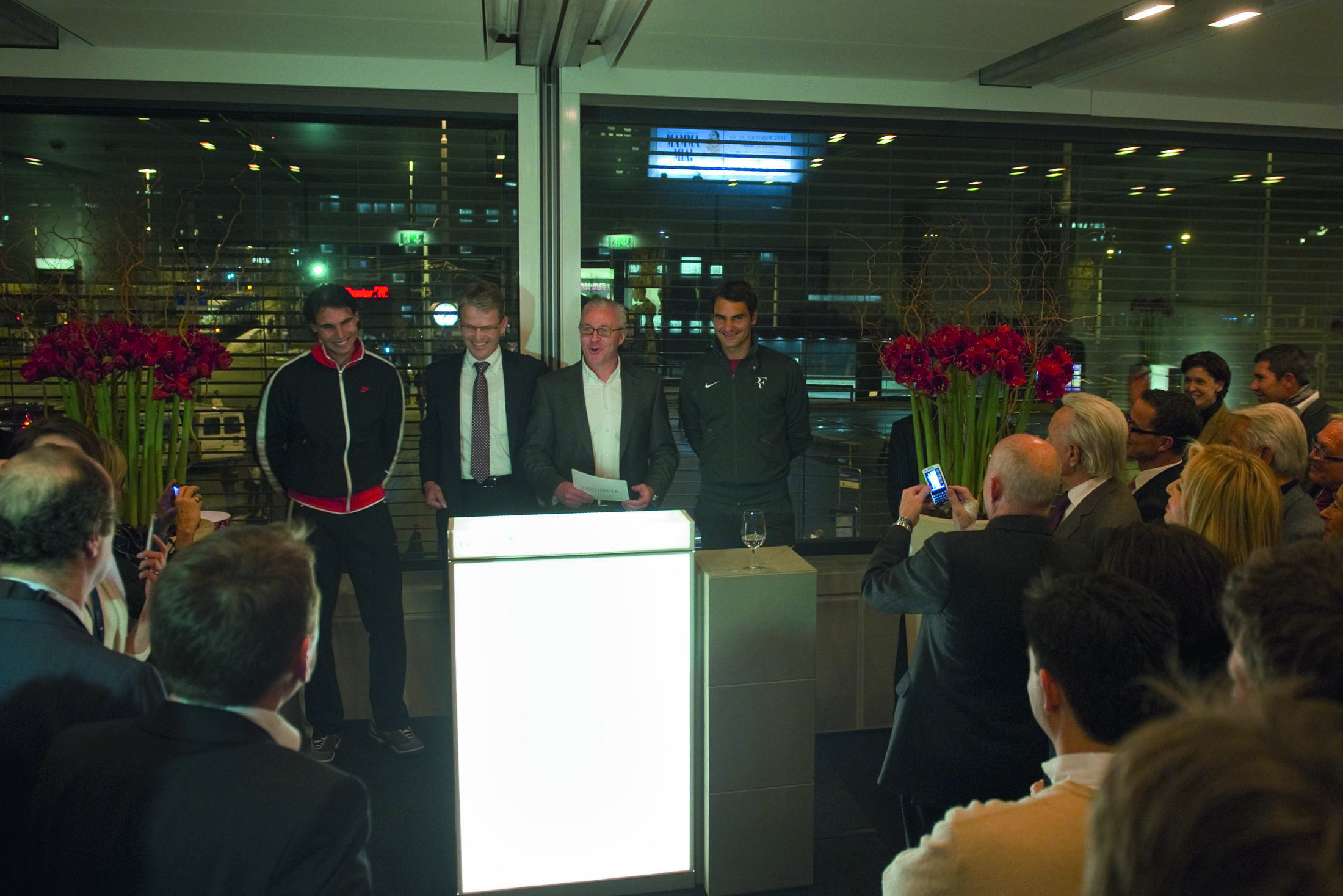 Als Georges Lüchinger 1965 in Montlingen geboren wurde, liess sich noch nicht erahnen, dass er eines Tages zwischen den besten Tennisspielern seiner Zeit stehen, den Schweizer Meisterpokal im Fussball in Händen halten oder für König Charles III. – damals noch der Prince of Wales – moderieren würde. Das liess sich auch noch nicht erahnen, als er die klassische Schullaufbahn mit Primar- und Sekundarschule sowie kaufmännischer Abendschule absolvierte. Ein erster Indikator dafür war, rückblickend, dass er beim FC Montlingen schon als Teenager die Funktionärs- und Trainerlaufbahn einschlug, statt sich regelmässig mit seinen Alterskollegen im Kampf um Bälle und Tore zu messen. «Ich war meiner Zeit oder meinem Alter voraus. Mit 16 war ich Vorstandsmitglied und Spiko in Montlingen, mit 17 Coach und Torwarttrainer bei der ersten Mannschaft», sagt Lüchinger über diese Zeit. Als er mit 23, schon beim USV, das B-Diplom als Trainer erlangte, war er zu jung, um die nächsthöhere Stufe zu erklimmen. Es folgten dennoch weitere Trainerstationen, so unter anderem der Aufstieg mit dem FC Widnau in die 1. Liga oder ein Engagement bei Austria Lustenau im Profibereich. Dass Lüchinger ebenfalls beim FC Ruggell war, hatte zwar keinen grossen Einfluss auf die Trainerkarriere, aber auf sein Leben. «Dort habe ich über den Fussball meine Frau kennengelernt, mit der ich nun seit 24 Jahren verheiratet bin und zwei mittlerweile erwachsene Kinder habe. So bin ich auch in Liechtenstein sesshaft geworden.»