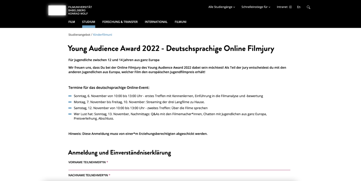 Die Bewerbungsfrist läuft noch bis Sonntag, 23. Oktober 2022. Weitere Informationen und das Bewerbungsformular sind zu finden unter: https://www.filmuniversitaet.de/studium/studienangebot/kinderfilmuni/young-audience-award-2022
