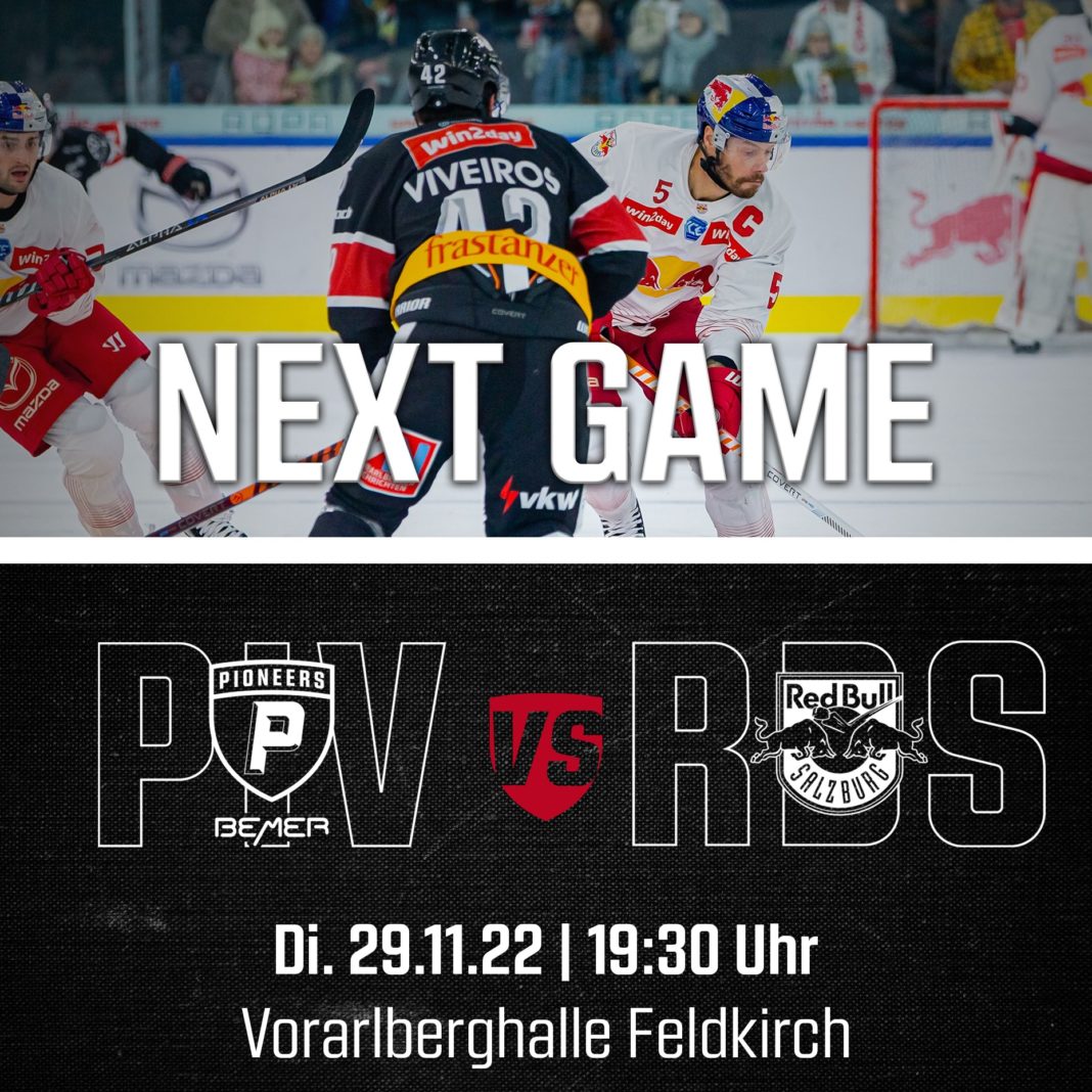 Ganze vier Wochen mussten die Eishockey-Fans in Vorarlberg auf erstklassiges Live-Hockey verzichten. Morgen Dienstag, 29.11.2022 meldet sich die Vorarlberghalle mit einem echten Kracher zurück: Der amtierende Meister und Champions Hockey League Achtelfinalist RB Salzburg duelliert sich mit den BEMER Pioneers Vorarlberg.