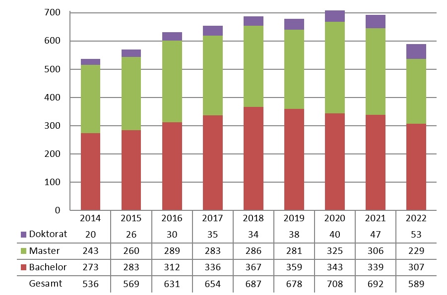 Eine Analyse zeigt, dass der Bachelorstudiengang Architektur diesem Trend nicht folgt: das Interesse der Studienbeginnerinnen und -beginner ist nach wie vor ungebrochen und die Zahl der Erstsemester in etwa konstant zu den Vorjahren. Positiv ist ebenfalls hervorzuheben, dass erstmals in der Geschichte der Universität mehr als 50 Studierende in Doktoratsstudiengängen inskribiert sind. Das ist ein erfreulicher Zuwachs von 13 Prozent.