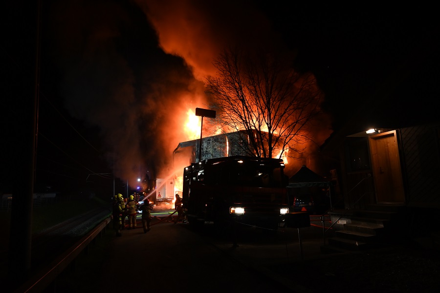 Kurz nach Mitternacht ging bei der Kantonalen Notrufzentrale die Meldung über einen Brand eines Stalls ein. Mehrere Feuerwehren rückten mit rund 70 Angehörigen und einigen Fahrzeugen aus. Sie wurden unterstützt durch einen Löschzug der SBB. Die ersten am Brandort eintreffenden Mitarbeitenden der Kantonspolizei St.Gallen sowie Feuerwehrangehörige fanden den Stall in Vollbrand vor.