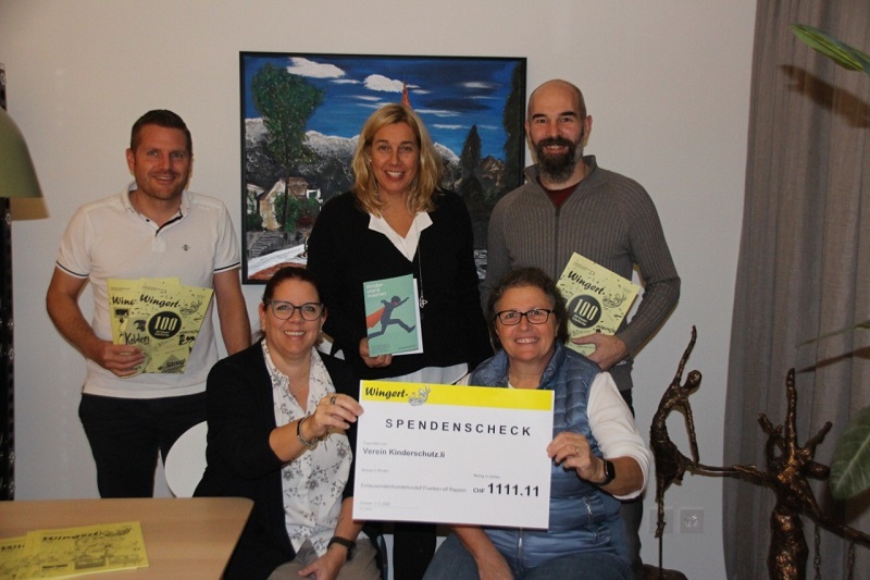 Bild: Hanno Konrad, Cilly Marxer und Ralf Wenaweser vom Wingertesel-Team überreichen Nadine Hilti und Alexandra Schiedt vom Verein Kinderschutz.li den Scheck über 1111.11 Franken.