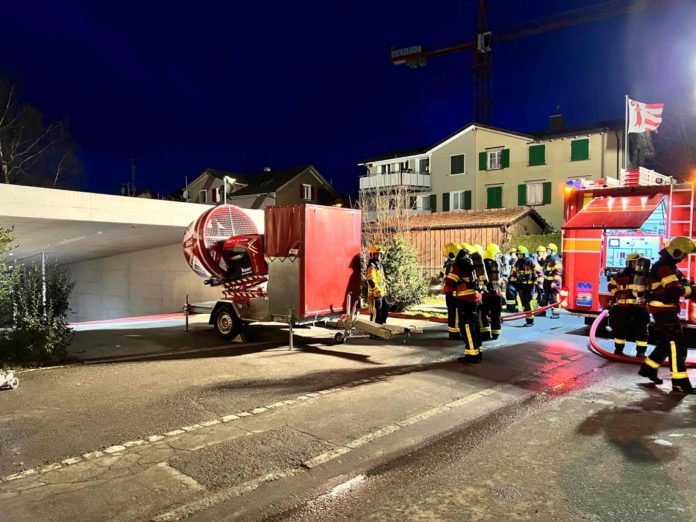Die nach der automatischen Brandmeldung aufgebotene Feuerwehr traf dichten Rauch an, der aus der Tiefgarage der Mehrfamilienhaus-Überbauung drang. Im Innern der Tiefgarage trafen die Feuerwehrleute ebenfalls dichten Rauch an. Die über der Tiefgarage stehenden Mehrfamilienhäuser konnten dank des schnellen Einsatzes der Feuerwehr rauchfrei gehalten werden. Zur Sicherheit wurden die rund 70 anwesenden Bewohnenden der rund 70 Wohnungen vorübergehend evakuiert. Der Feuerwehr gelang es zwischenzeitlich weiter in die Tiefgarage einzudringen und mehrere brennende Fahrzeuge zu löschen. Rund eine Stunde nach Eingang der automatischen Brandmeldung war der Brand gelöscht.