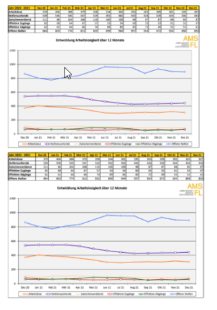 Eine fundierte und umfassende Information zur Entwicklung der Arbeitslosigkeit ist von allgemeinem Interesse. Bis Ende 2021 wurde der Verlauf zu Arbeitslosen, Stellensuchenden, Zwischenverdiensten, effektive Zu- und Abgänge sowie offene Stellen übersichtlich in einem Linien-Diagramm und einer Tabelle mit Einzelheiten wie Alter und so weiter dargestellt.