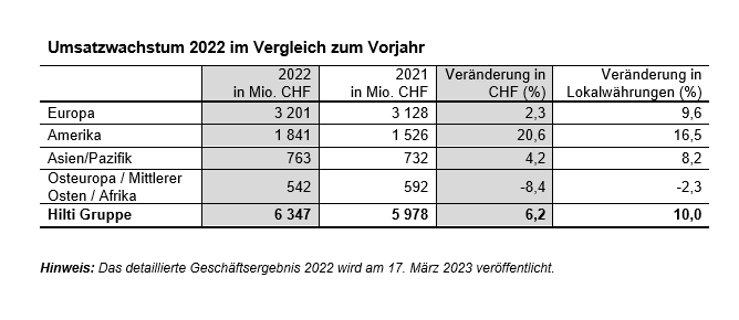 Schaan (FL), 25. Januar 2023 – In einem volatilen Umfeld hat die Hilti Gruppe 2022 den Umsatz in Lokalwährungen um 10,0 Prozent gesteigert. In Schweizer Franken resultierte ein Wachstum von 6,2 Prozent auf über CHF 6,3 Mrd.