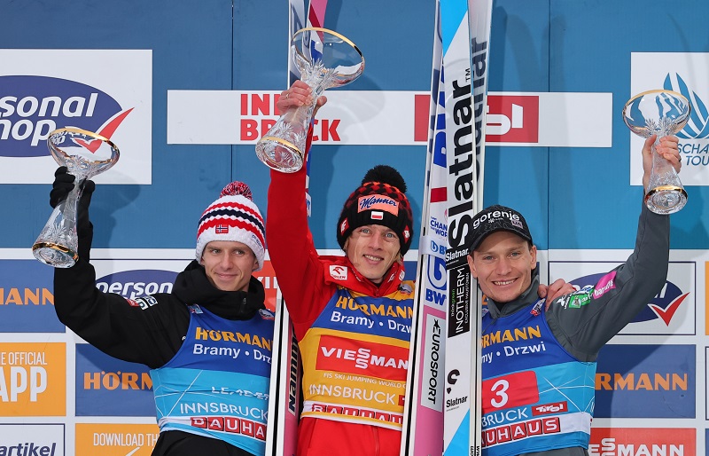 Ski nordisch/Skispringen: Vierschanzentournee, Weltcup, Innsbruck, Großschanze, Herren. (l-r) Halvor Egner Granerud (Norwegen, Zweiter), Dawid Kubacki (Polen, Erster) und Anze Lanisek (Slowenien, Dritter) auf dem Podium nach dem Springen. Foto: Picture Alliance, FFM