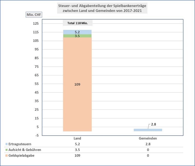Wie die Tabelle zeigt, belief sich das Total der Geldspielabgabe von 2017 bis und mit dem Jahr 2021 auf über CHF 109 Mio. Die Ertragssteuer aller liechtensteinischen Spielbanken betrug im gleichen Zeitraum hingegen nur CHF 8.1 Mio. Der Ertragssteueranteil davon für alle Gemeinden betrug lediglich rund CHF 2.8 Mio. Dies bedeutet, dass die Gemeinden von den Gesamteinnahmen der öffentlichen Hand (inkl. Aufsichtsabgabe und Gebühr) rund CHF 2.8 Mio. erhielten, während dem Land über CHF 118 Mio. zufielen. Damit besteht bereits heute eine ungerechtfertigte Aufteilung zwischen Land und Gemeinden.