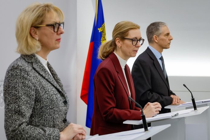 Regierungsrätin Graziella Marok-Wachter, Regierungschef-Stellvertreterin Sabine Monauni und Jürg Senn, Energiefachstelle, präsentieren die Energievorschriften für Gebäude an der Medienorientierung. Quelle: IKR