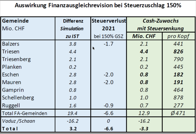 Aus der nachstehenden Tabelle wird ersichtlich, dass Triesen durch diesen Vorgang mit 4.4 Millionen Franken respektive 826 Franken pro Kopf deutlich mehr profitiert als zum Beispiel Eschen und Mauren, denen bei einer Steuersenkung auf 150 Prozent weniger als 200 Franken pro Einwohner (!) verbleiben wird. Auch Balzers mit 441 und Ruggell mit 277 Franken pro Kopf bleiben deutlich hinter den Gemeinden Triesen, Triesenberg oder Schellenberg zurück. Bei Schellenberg wirkt sich die lineare Ausgestaltung des Einwohnerzuschlags mit einem Geschenk von über 400’000 Franken pro Jahr aus, während diesbezüglich Planken, Triesenberg und Gamprin weniger erhalten.