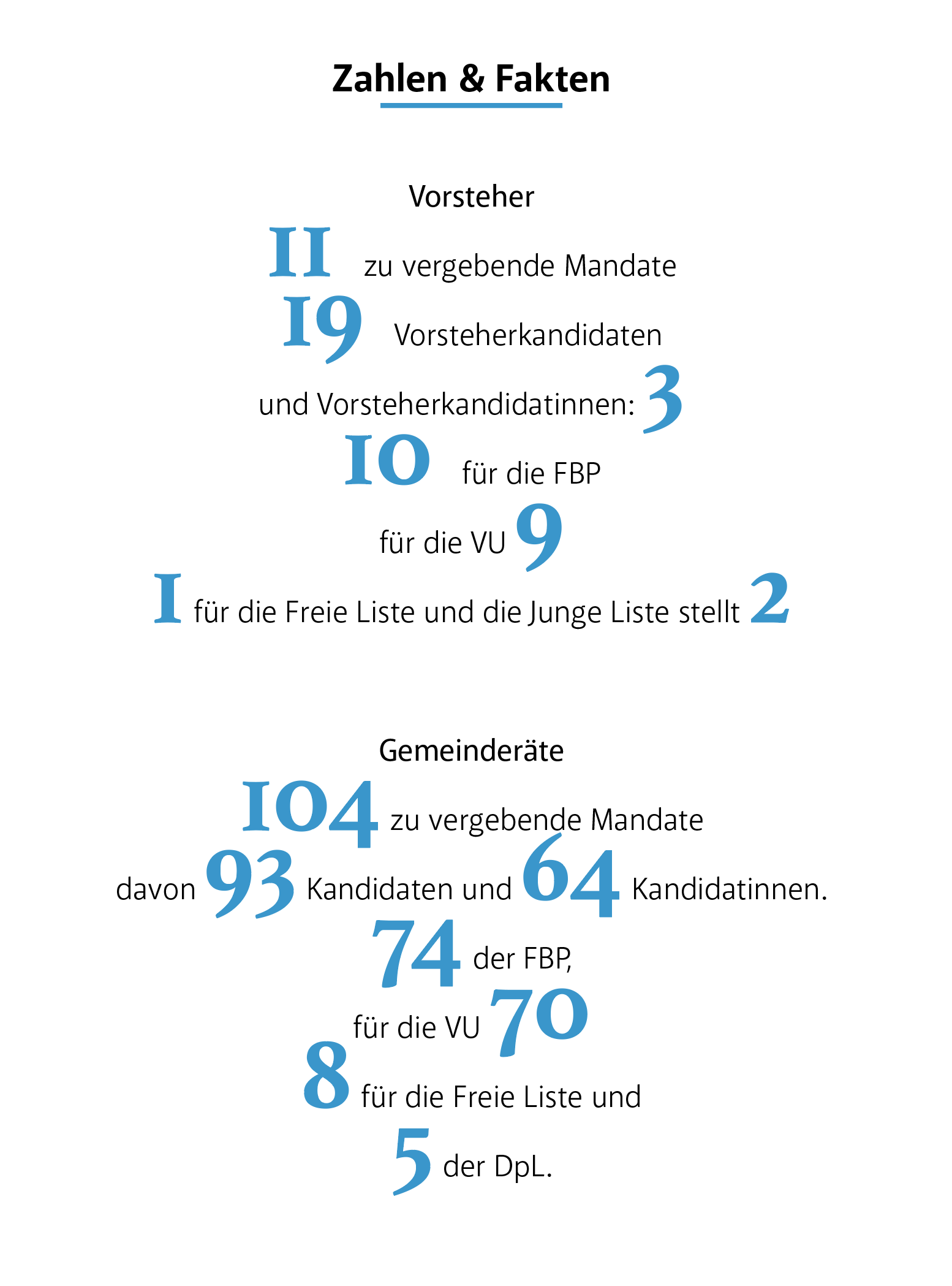 In drei Wochen finden die Vorsteher- und Gemeinderatswahlen statt. Seit dem 20. Januar steht fest, wer sich um die elf Vorsteher- und 104 Gemeinderatssitze bewirbt. Ein Rekord ist beim Frauenanteil mit gut 41 Prozent erreicht, ein Negativrekord in Bezug auf die jüngere Vergangenheit bei der Anzahl der Kandidaten. Ein Novum ist, dass die Wahlberechtigten in Planken in Sachen Gemeinderat nicht die Qual der Wahl, sondern keine Wahl haben.