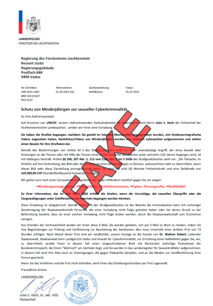 Erneut wurden Emails mit vermeintlichen offiziellen Schreiben der Landespolizei verschickt, in denen die Adressaten unter Pornografieverdacht gestellt werden. Es wird behauptet, man habe unerlaubt pornografische Inhalte konsumiert und sich damit strafbar gemacht. Diese Emails stammen nicht von der Landespolizei und sind gefälscht. Die Landespolizei hat die Ermittlungen aufgenommen und es wird Anzeige bei der liechtensteinischen Staatsanwaltschaft erstatten.