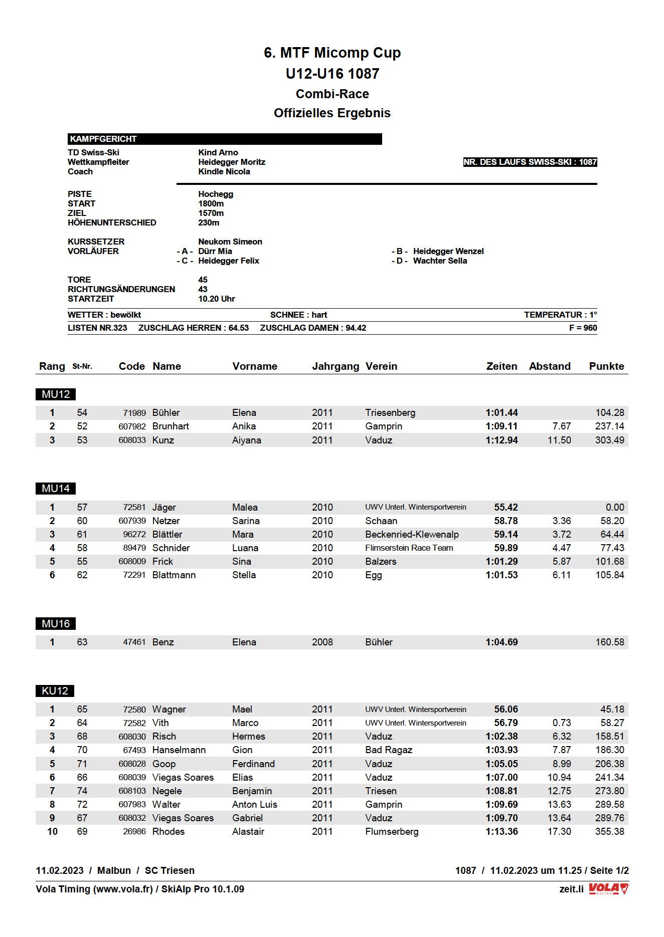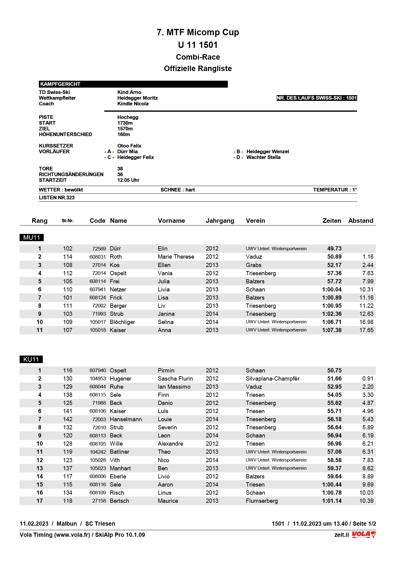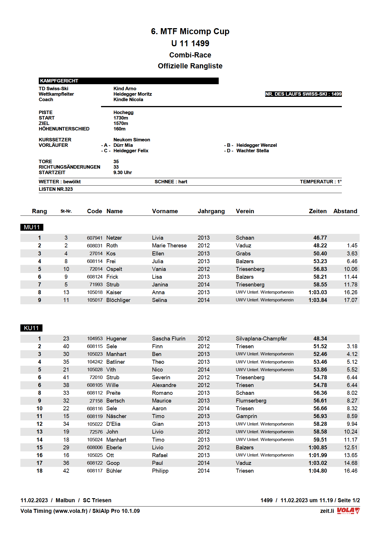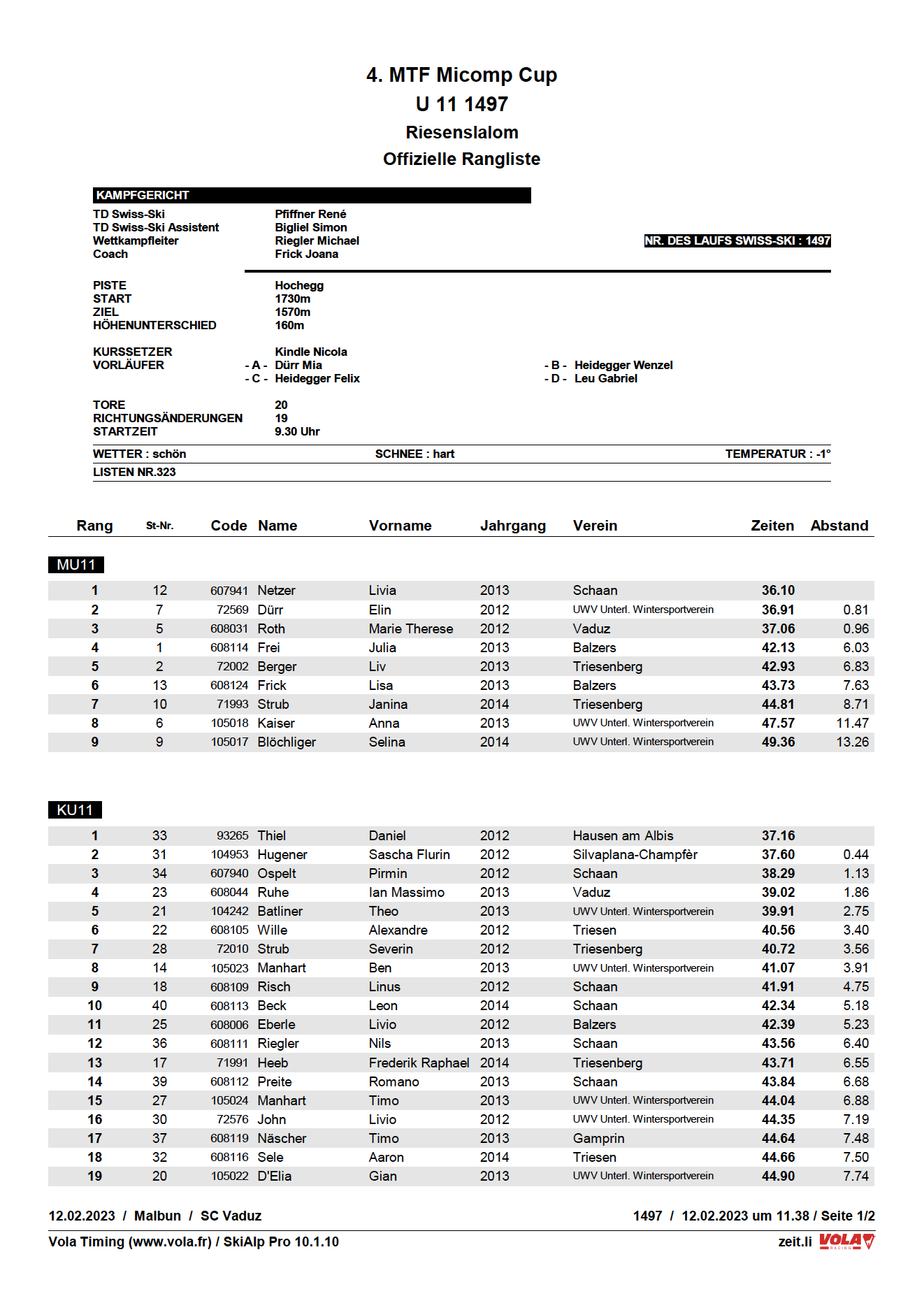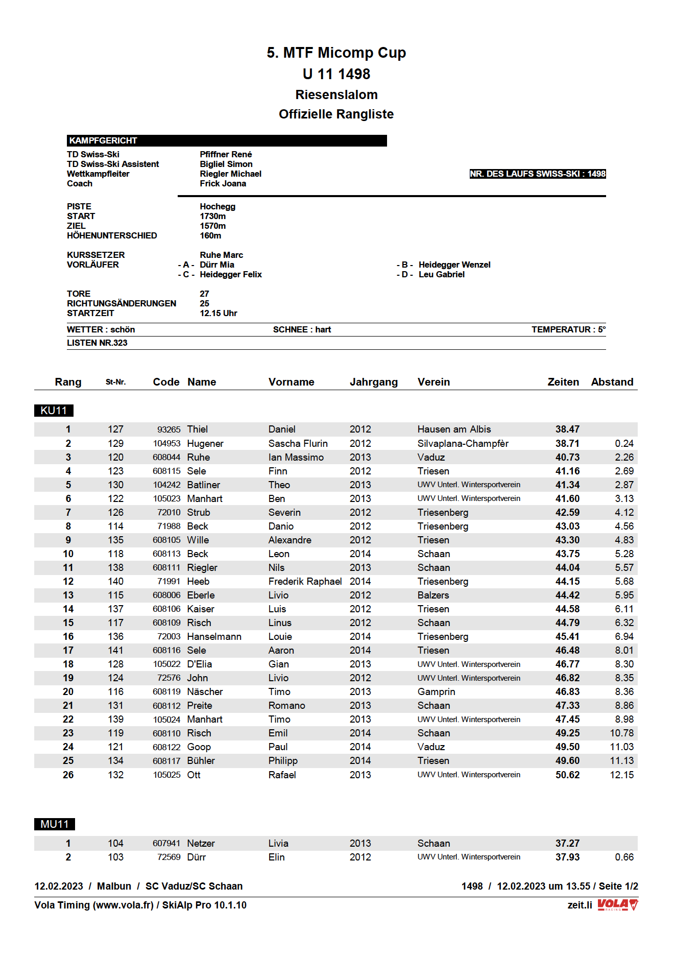 Am Samstag, 11. Februar 2023 fanden die Rennen 6 & 7 des MTF Ski Nachwuchs Cups in Malbun statt. Durchgeführt wurden die beiden Rennen als Combi Race vom SC Triesen. Die Verhältnisse und das Wetter waren sehr gut, nur zeitweise war der Himmel ein wenig bewölkt. Unsere LSV Athleten waren sehr erfolgreich und konnten beide Tagessiege einfahren: