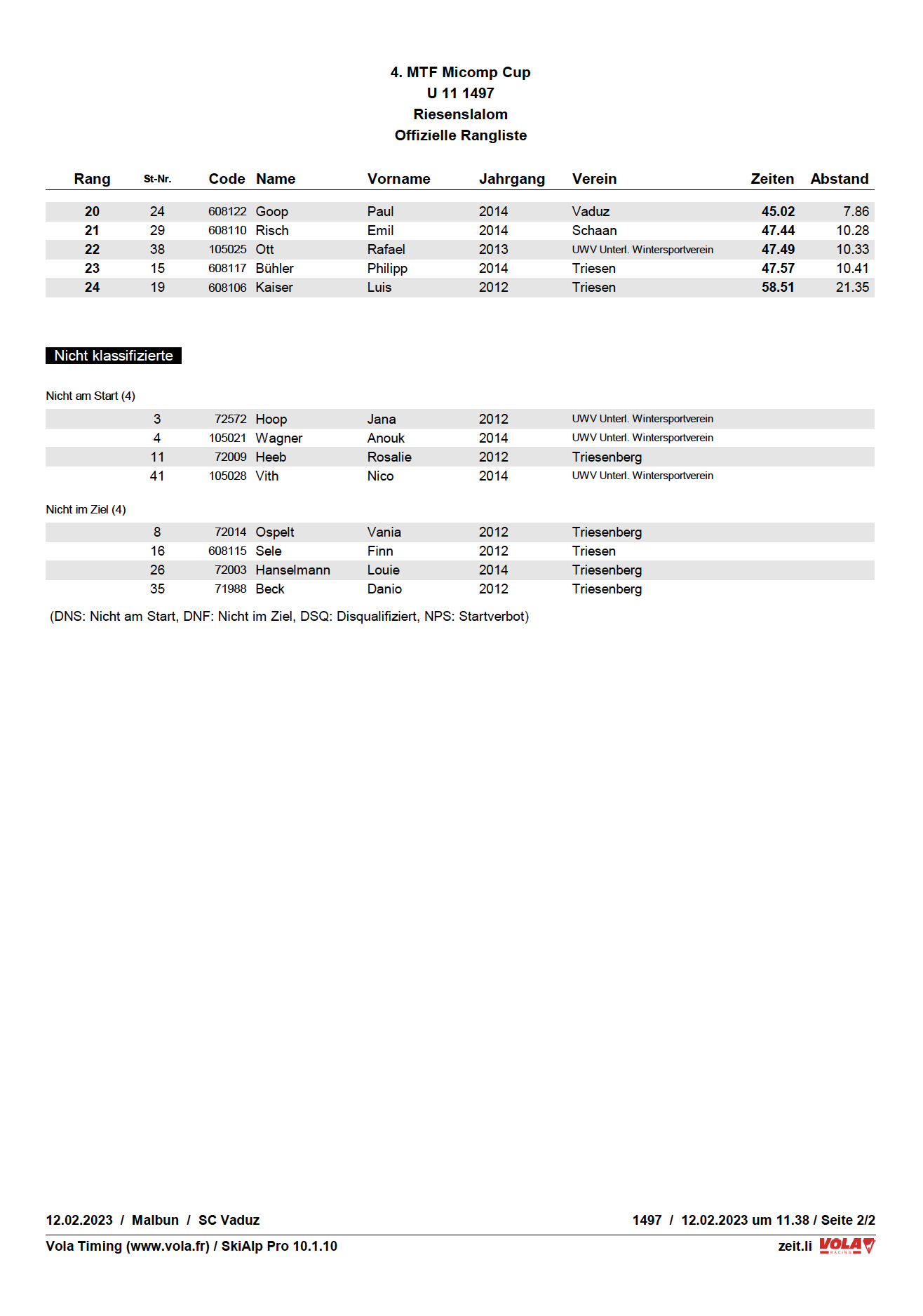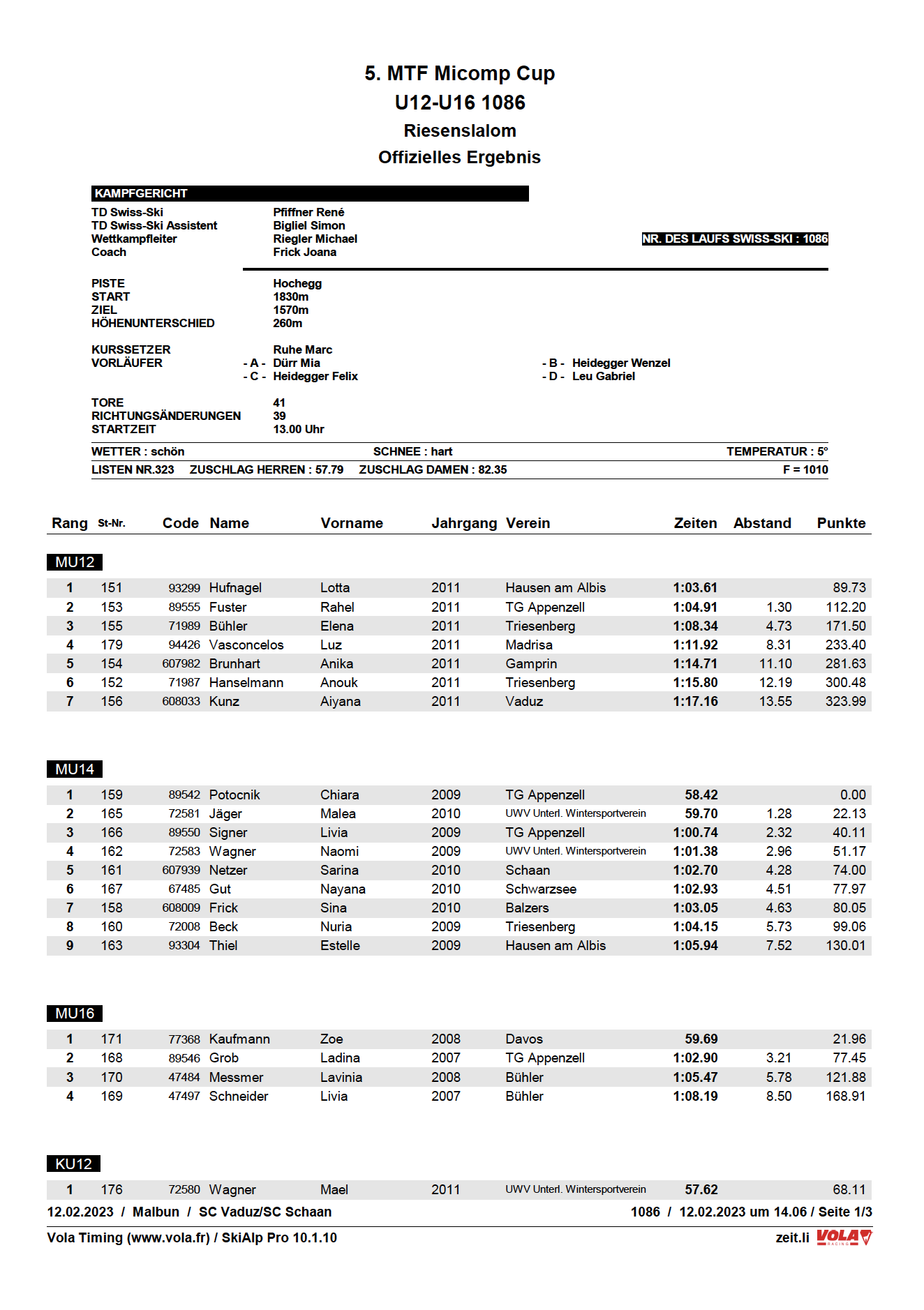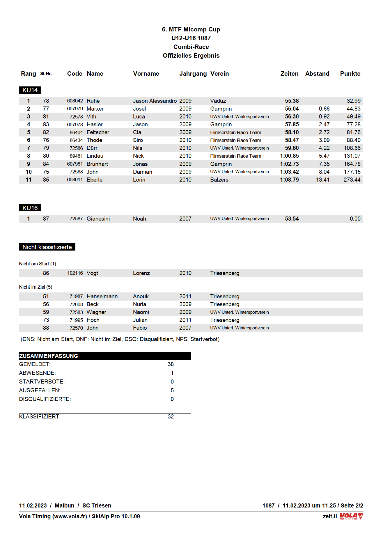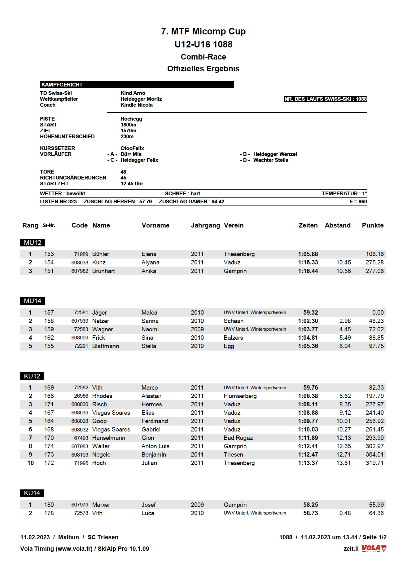 Am Samstag, 11. Februar 2023 fanden die Rennen 6 & 7 des MTF Ski Nachwuchs Cups in Malbun statt. Durchgeführt wurden die beiden Rennen als Combi Race vom SC Triesen. Die Verhältnisse und das Wetter waren sehr gut, nur zeitweise war der Himmel ein wenig bewölkt. Unsere LSV Athleten waren sehr erfolgreich und konnten beide Tagessiege einfahren: