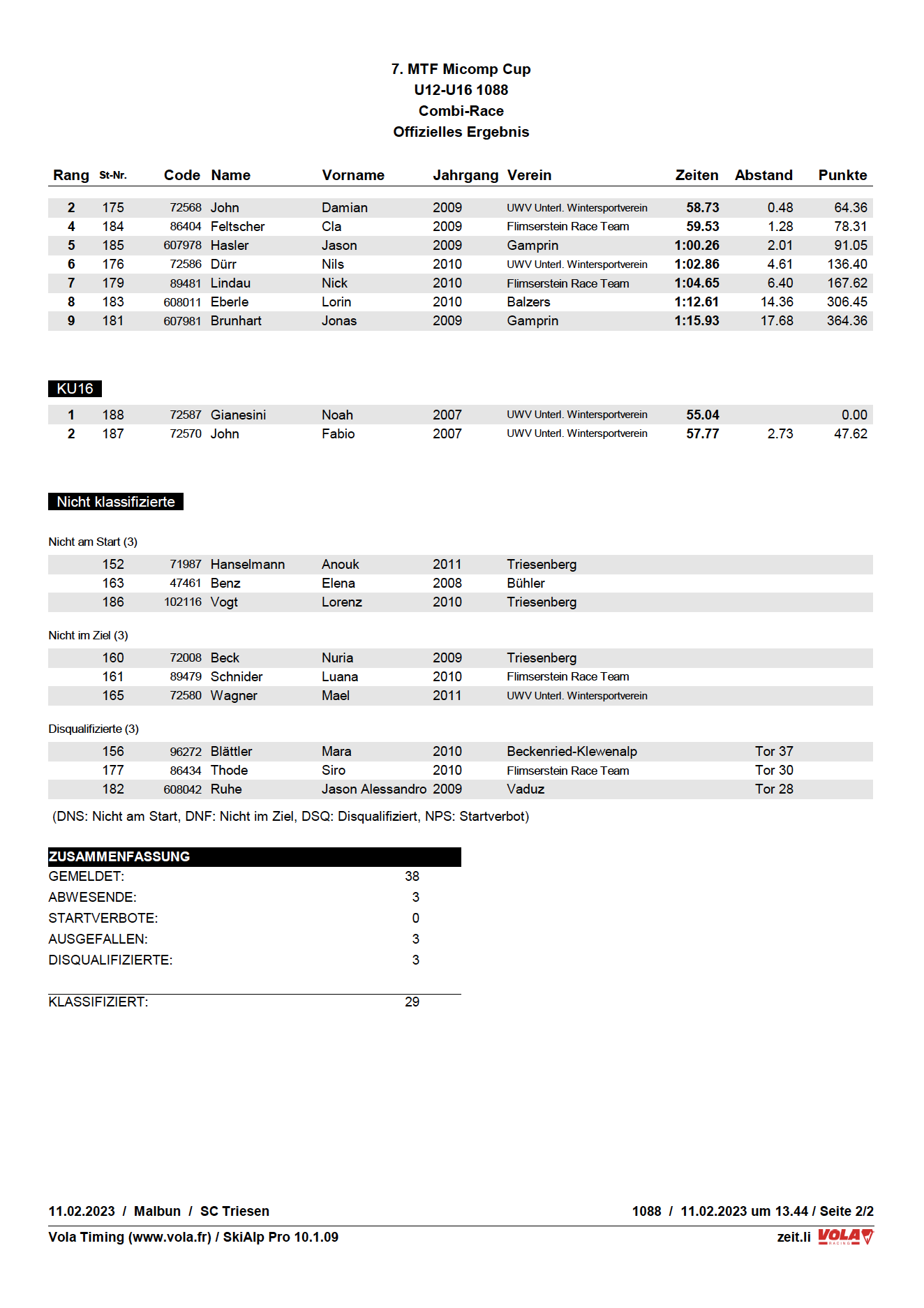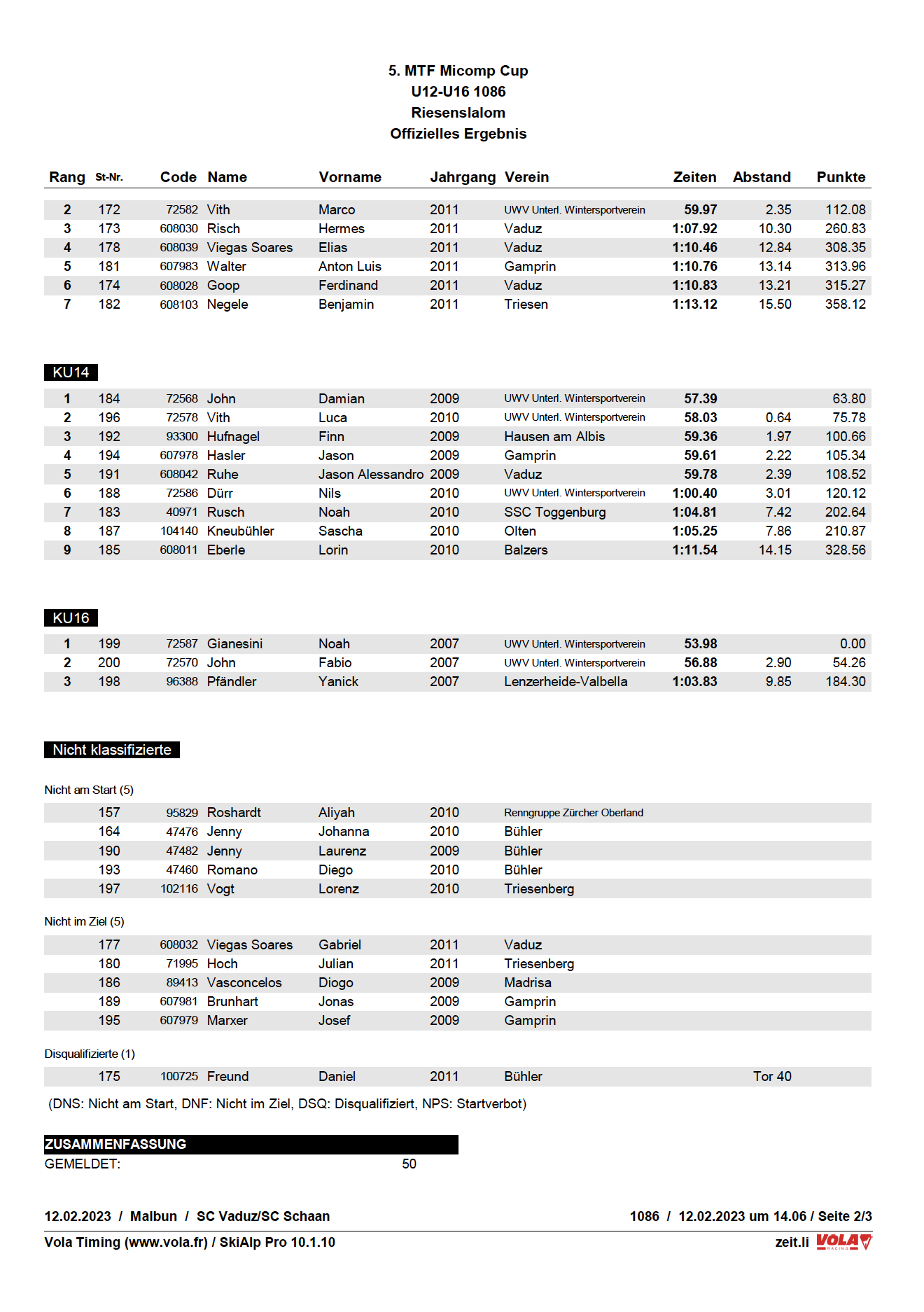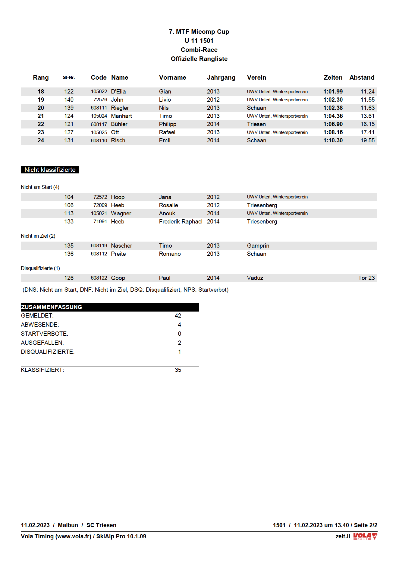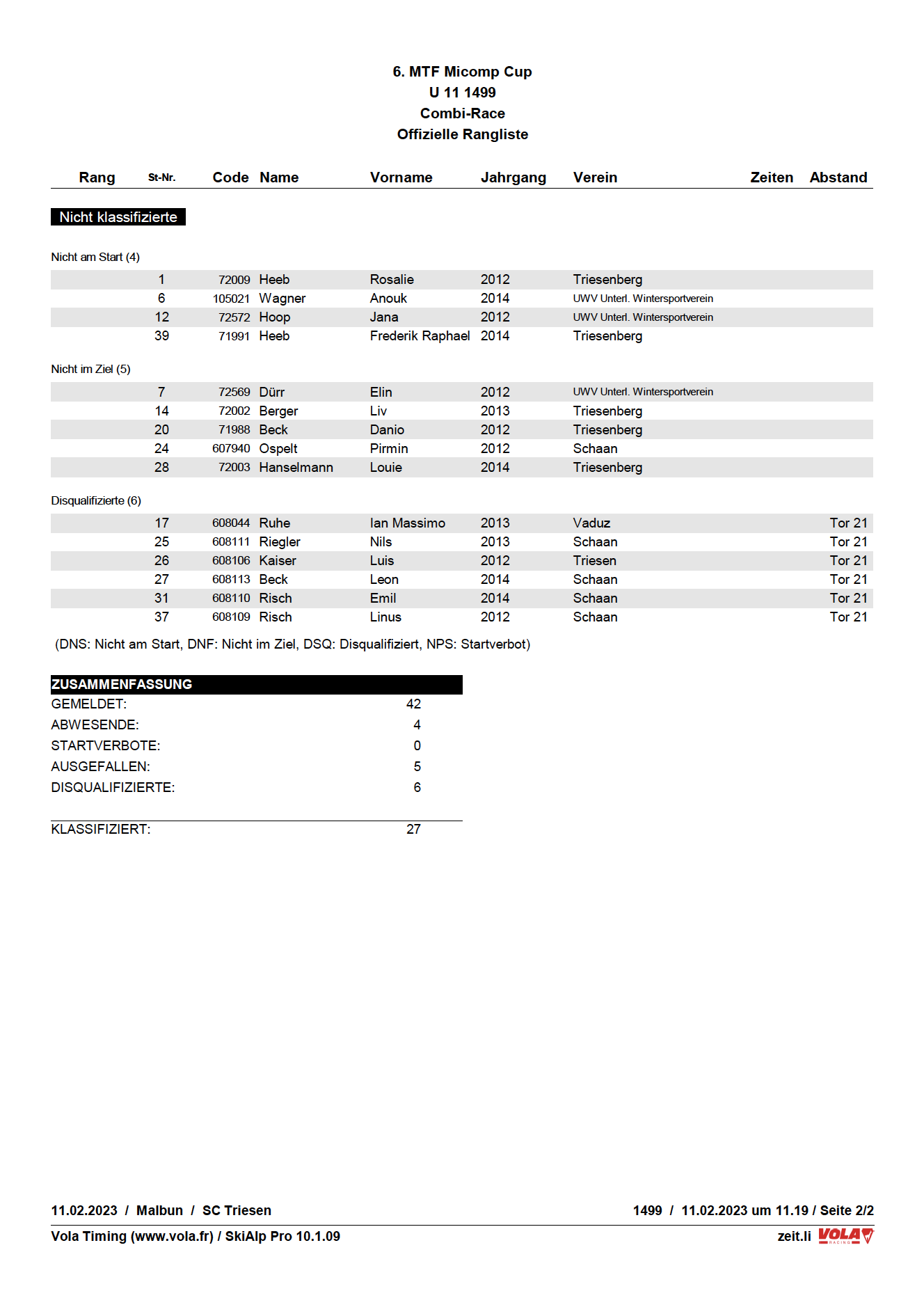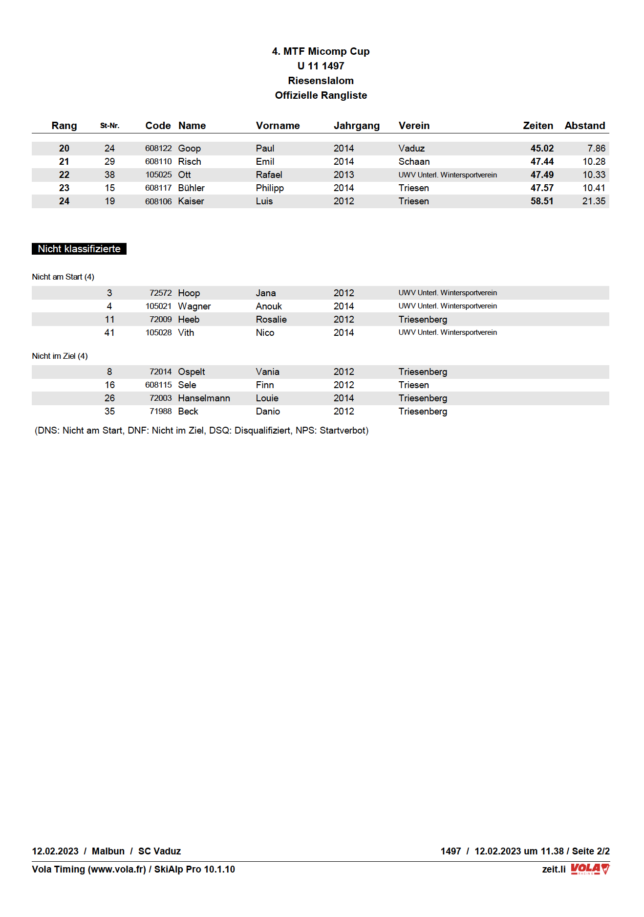 Am Samstag, 11. Februar 2023 fanden die Rennen 6 & 7 des MTF Ski Nachwuchs Cups in Malbun statt. Durchgeführt wurden die beiden Rennen als Combi Race vom SC Triesen. Die Verhältnisse und das Wetter waren sehr gut, nur zeitweise war der Himmel ein wenig bewölkt. Unsere LSV Athleten waren sehr erfolgreich und konnten beide Tagessiege einfahren: