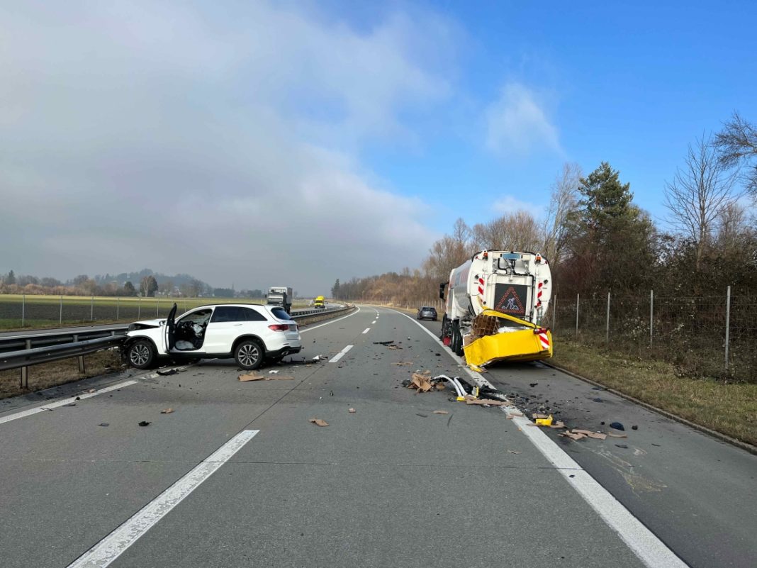 Ein 64-jähriger Autofahrer prallte mit seinem Auto in die Putzmaschine des Unterhaltsdienstes, welche auf dem Pannenstreifen unterwegs war. Der 64-Jährige wurde leicht verletzt.