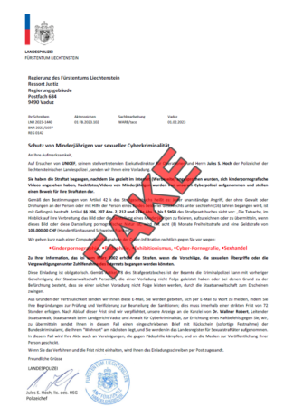 Es wird behauptet, man habe unerlaubt pornografische Inhalte konsumiert und sich damit strafbar gemacht. Diese Emails stammen nicht von der Landespolizei und sind gefälscht. Die Landespolizei hat die Ermittlungen aufgenommen und es wird Anzeige bei der liechtensteinischen Staatsanwaltschaft erstatten.