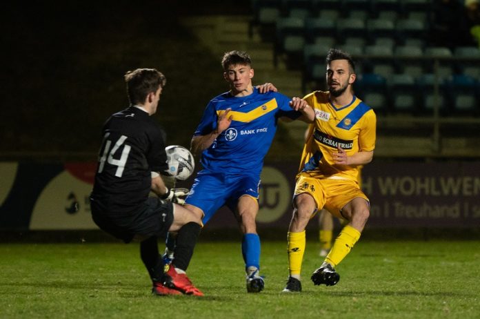 Szene vom heutigen Cupspiel zwischen Balzers I und Balzers II um den Einzug ins Finale gegen den FC Vaduz oder den USV Eschen-Mauren. Im Bild rechts der zweifache Torschütze Medin Murati. Foto: Jürgen Posch.