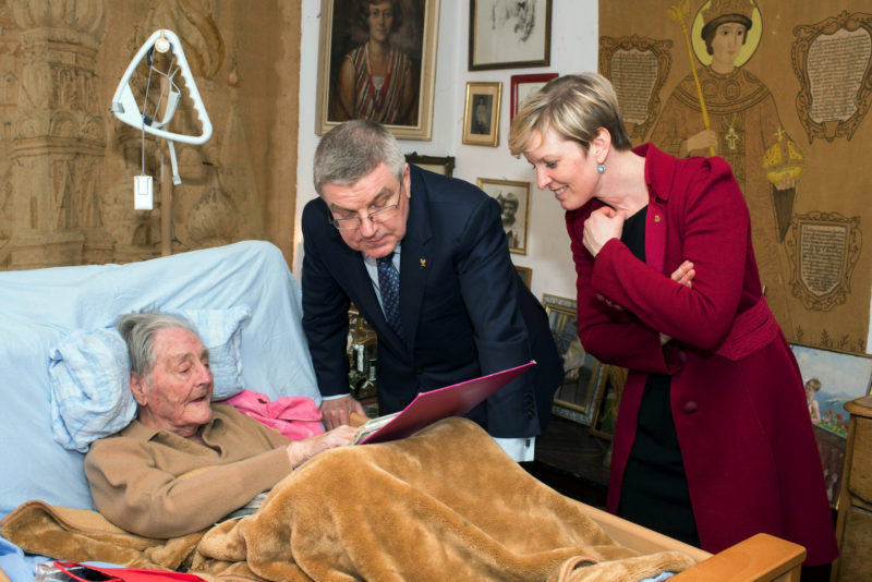 IOC-Präsident Dr. Thomas Bach und Isabel Fehr zu Besuch beim Liechtensteiner Sportpionier Baron Eduard von Falz-Fein am 10 August 2018 in seiner Villa in Vaduz. Baron von Falzfein war damals 106 Jahre alt.