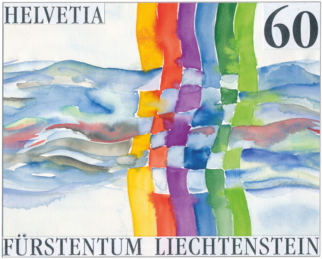 Die freundschaftliche Verbundenheit zwischen Liechtenstein und der Schweiz lässt sich unter anderem an den Gemeinschaftsbriefmarken erkennen, welche in Zusammenarbeit beider Länder ausgegeben werden. Die Briefmarken sind dementsprechend in beiden Ländern erhältlich und voll frankaturgültig. Die erste Gemeinschaftsbriefmarke (1995) verdeutlicht diese Verbundenheit, indem auf ihr die beiden Staatsbezeichnungen «HELVETIA» und «FÜRSTENTUM LIECHTENSTEIN» stehen. Gestaltet wird die Briefmarke von der Liechtensteiner Künstlerin Cornelia Eberle. Mit ihrer Aquarellzeichnung eines Flusses, welcher mit seinen Wellen aufgefächerte, farbige Linien kreuzt und sich mit diesen verwebt, bringt sie gekonnt die vielfältigen engen Beziehungen zweier guter Nachbarn zum Ausdruck.