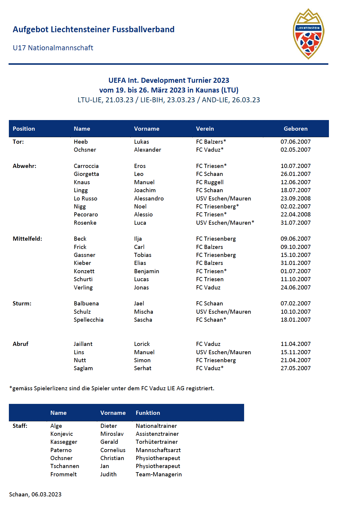 Die U17-Nationalmannschaft nimmt vom 20. bis 26. März 2023 an einem UEFA Development Turnier in Litauen teil. Dort trifft die Mannschaft von Nationaltrainer Dieter Alge zunächst auf die Alterskollegen des Gastgebers, auf Bosnien & Herzegowina sowie auf Andorra.