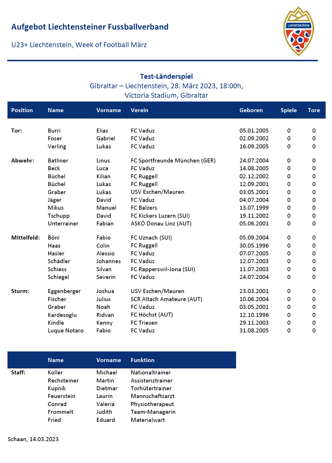 Nachdem der Liechtensteiner Fussballverband aus Gründen der Jahrgangszusammenstellung in diesem Jahr auf die Anmeldung einer U21-Nationalmannschaft verzichtete, wird eine U23+-Auswahl Länderspiele austragen. Die Premiere dieses Teams wird am 28. März 2023 auswärts gegen die U21 von Gibraltar stattfinden. Dazu hat Nationaltrainer Michael Koller vorerst 24 Spieler aufgeboten.