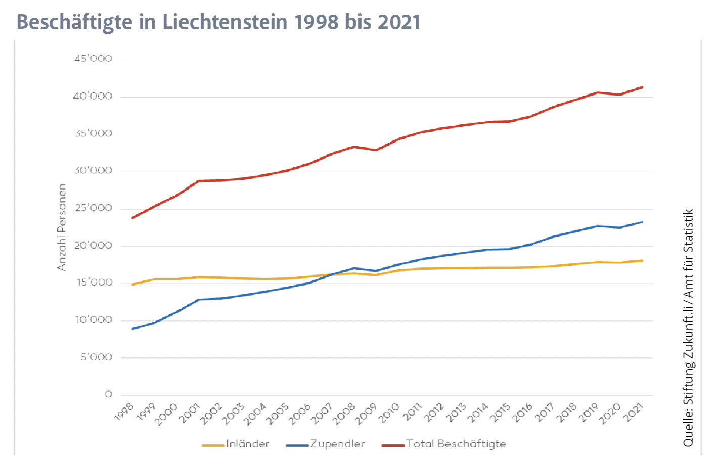Ein Blick auf die Beschäftigungsstatistik zeigt: Die liechtensteinische Wirtschaft ist in den letzten Jahrzehnten weniger über die Produktivität, sondern vor allem über eine Zunahme der geleisteten Arbeitsstunden gewachsen. Besonders eindrücklich ist diese Entwicklung bei den Grenzgängern: Pendelten 1998 noch weniger als 9’000 Personen zur Arbeit nach Liechtenstein, waren es 2021 bereits über 23’000. 2008 arbeiteten erstmals mehr Grenzgänger als inländische Erwerbstätige in Liechtenstein. Und das Wachstum setzte sich rasant fort: Allein in den vier Jahren vor dem Corona-Jahr 2020 sind durchschnittlich knapp 1’000 Beschäftigte pro Jahr hinzugekommen.