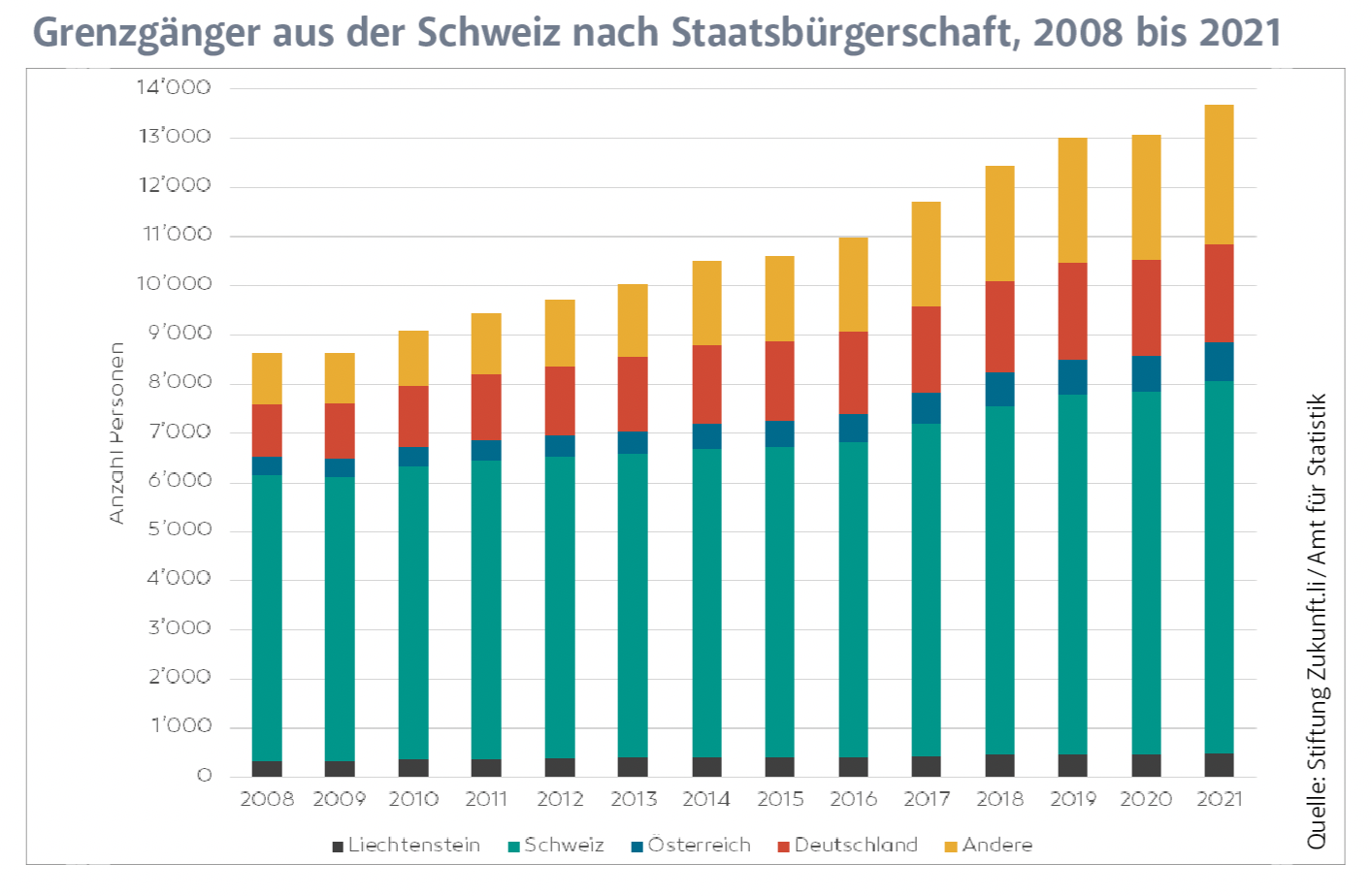 Deutlich zugenommen hat die Zahl der Grenzgänger aus der Schweiz und zwar um 60 Prozent von gut 8’600 im Jahr 2008 auf fast 13’700 im Jahr 2021. Die Zahl der Grenzgänger aus der Schweiz mit Schweizer Staatsbürgerschaft stieg um rund 1’700 Personen, was einem Zuwachs von 30 Prozent entspricht. Die Zahl der in der Schweiz wohnhaften Grenzgänger ohne Schweizer Staatsbürgerschaft hat hingegen um fast 120 Prozent bzw. 3’300 Personen zugenommen. Am stärksten gewachsen ist auch hier der Anteil der Personen mit «anderer» Staatsbürgerschaft. Ihre Zahl stieg im gleichen Zeitraum von rund 1’000 auf 2’900, was einer Zunahme um mehr als 1’800 Personen bzw. 180 Prozent entspricht. Bei den Personen mit «anderer» Staatsbürgerschaft handelt es sich insbesondere um EWR-Bürgerinnen und -Bürger, wobei Personen mit italienischem, portugiesischem und ungarischem Pass am stärksten vertreten sind.